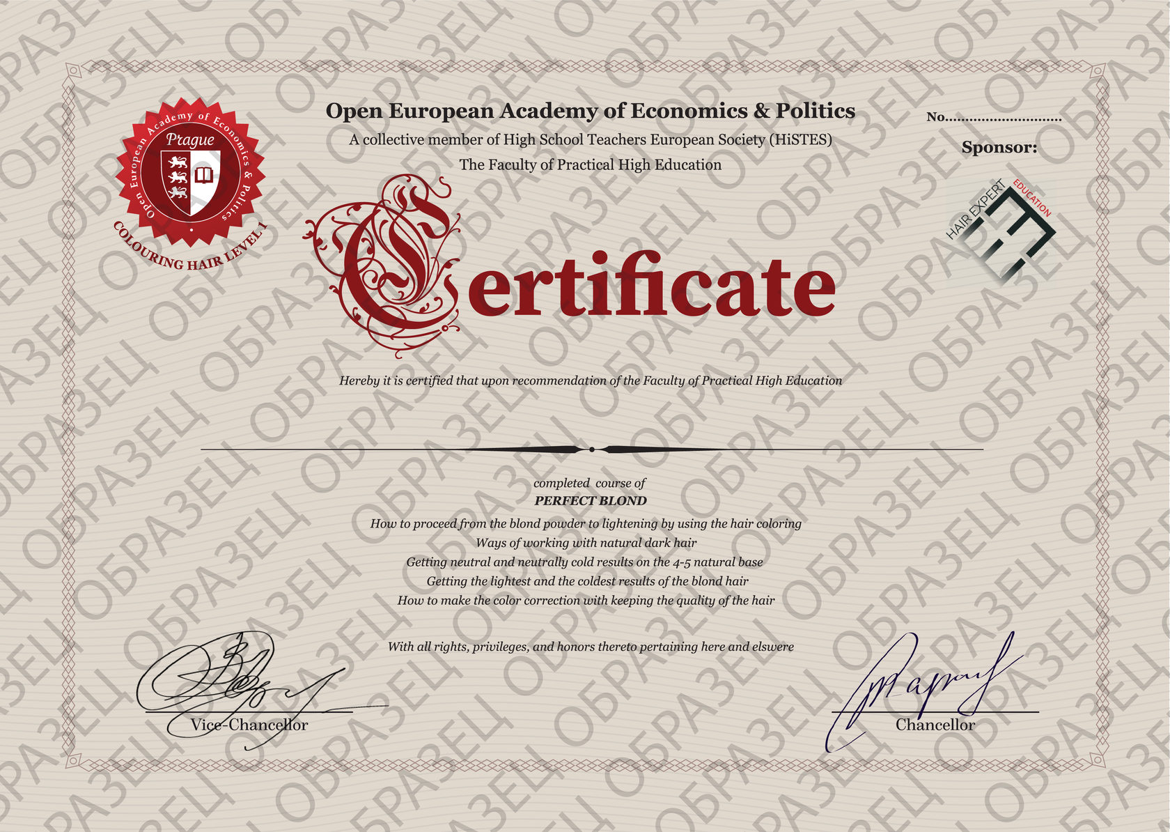 По итогу успешного прохождения семинара TECHNICAL BLOND мастера получают внутренний ДИПЛОМ HAIR EXPERT и международный сертификат Факультета практического образования Открытой европейской академии экономики и политики, Прага.