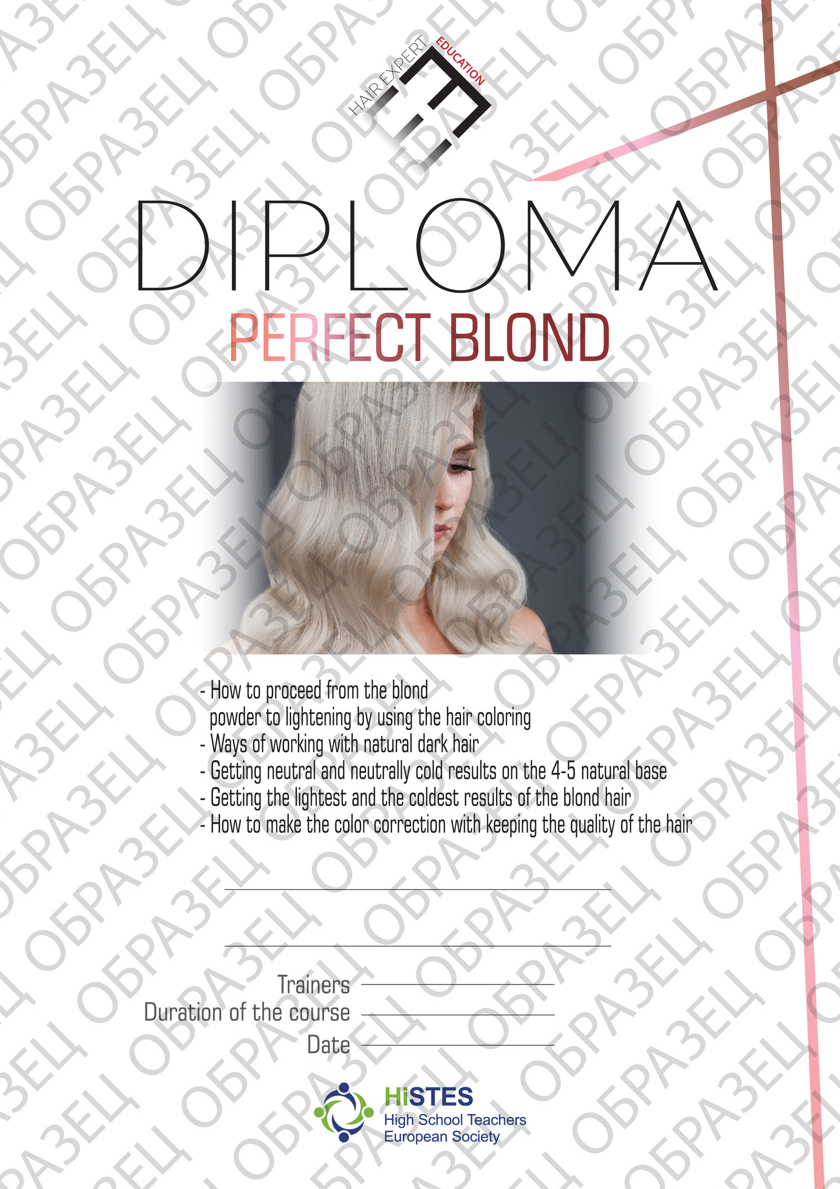 По итогу успешного прохождения семинара PERFECT BLOND мастера получают внутренний ДИПЛОМ HAIR EXPERT и международный сертификат Факультета практического образования Открытой европейской академии экономики и политики, Прага.