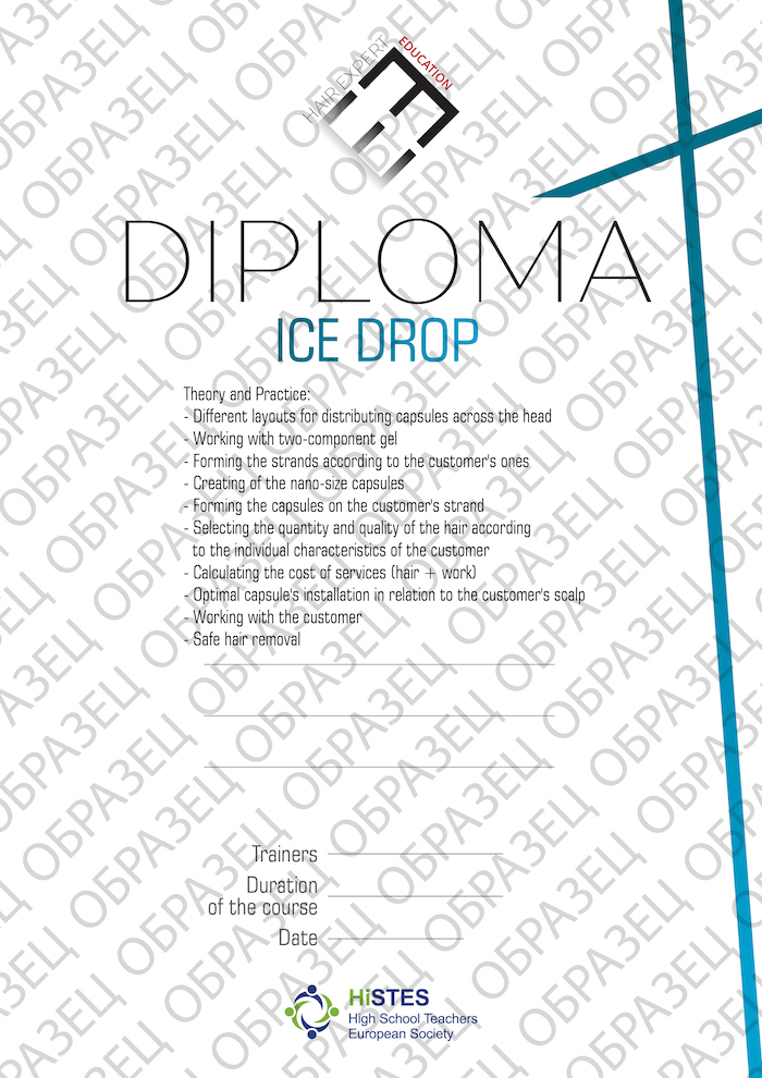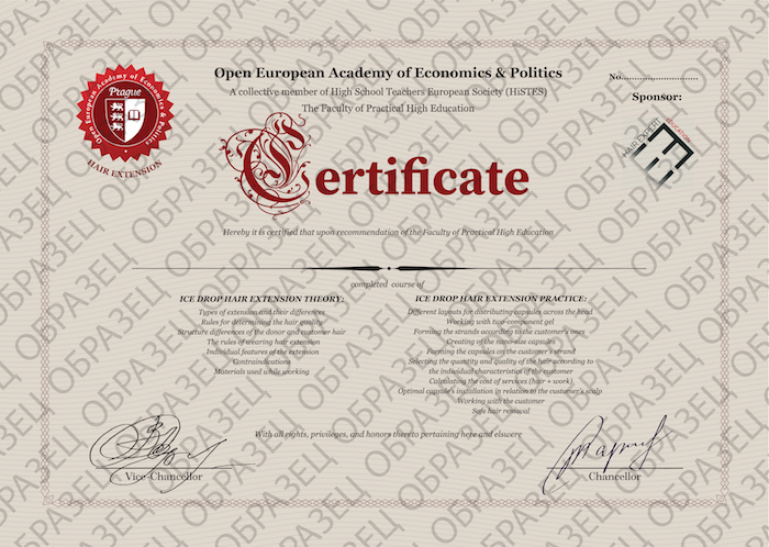 По итогу успешного прохождения семинара ХОЛОДНОЕ ГЕЛЕВОЕ НАРАЩИВАНИЕ ICE DROP мастера получают внутренний ДИПЛОМ HAIR EXPERT и международный сертификат Факультета практического образования Открытой европейской академии экономики и политики, Прага.