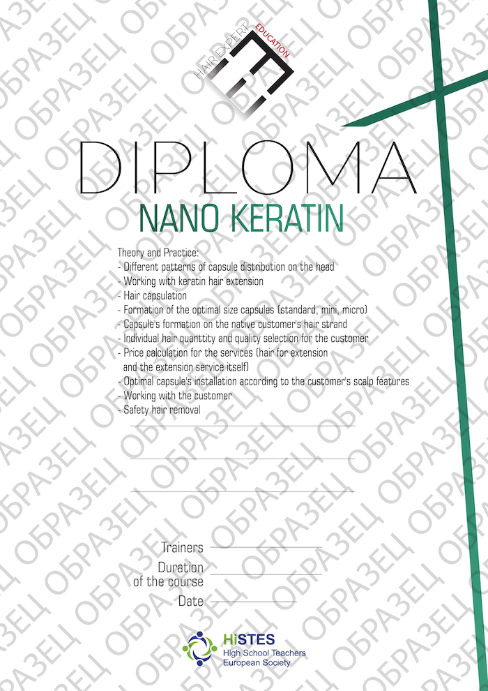 По итогу успешного прохождения семинара НАНО КЕРАТИН мастера получают внутренний ДИПЛОМ HAIR EXPERT и международный сертификат Факультета практического образования Открытой европейской академии экономики и политики, Прага.
